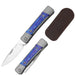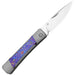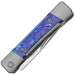 The standout feature is the Titanium Damascus inlay, bringing swirling patterns of electric blues, purples, and fiery oranges into the minimalist titanium frame. It gives the knife an unmistakable visual identity, without sacrificing durability or comfort in the hand.