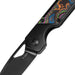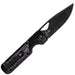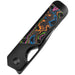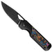 The handle pairs titanium construction with a vivid six-color “Camo Carbon 80’s” inlay that glows under UV light for a unique effect. Chamfered edges provide all-day comfort in hand, while the multi-colored inlay adds an eye-catching touch that sets this model apart.