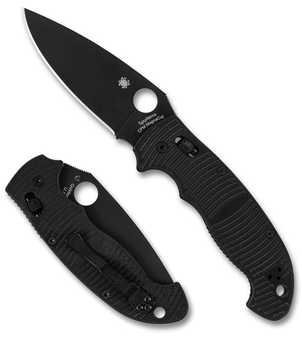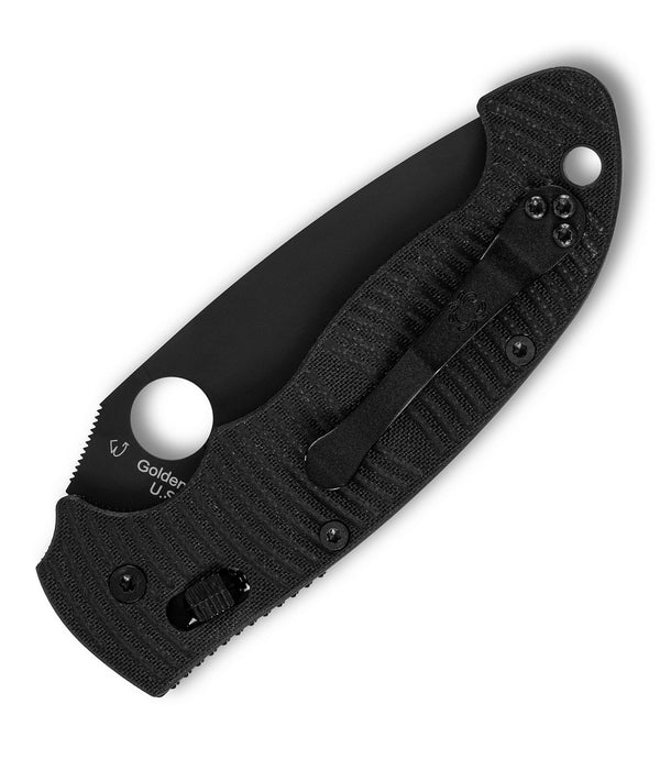 The handle is constructed from black G-10 with Spyderco's signature Caribbean Bi-Directional Texture™, providing a secure grip in all conditions. Skeletonized stainless steel liners add structural strength without unnecessary weight, and the handle's design accommodates both right and left-handed users.